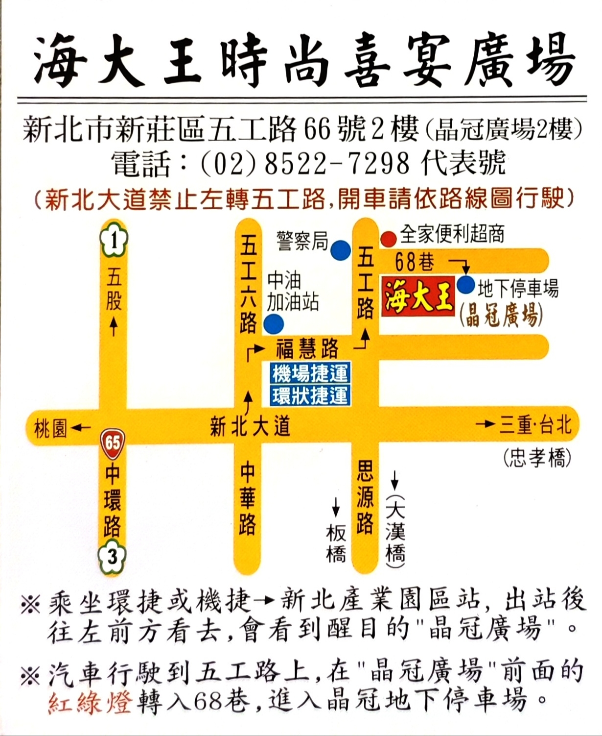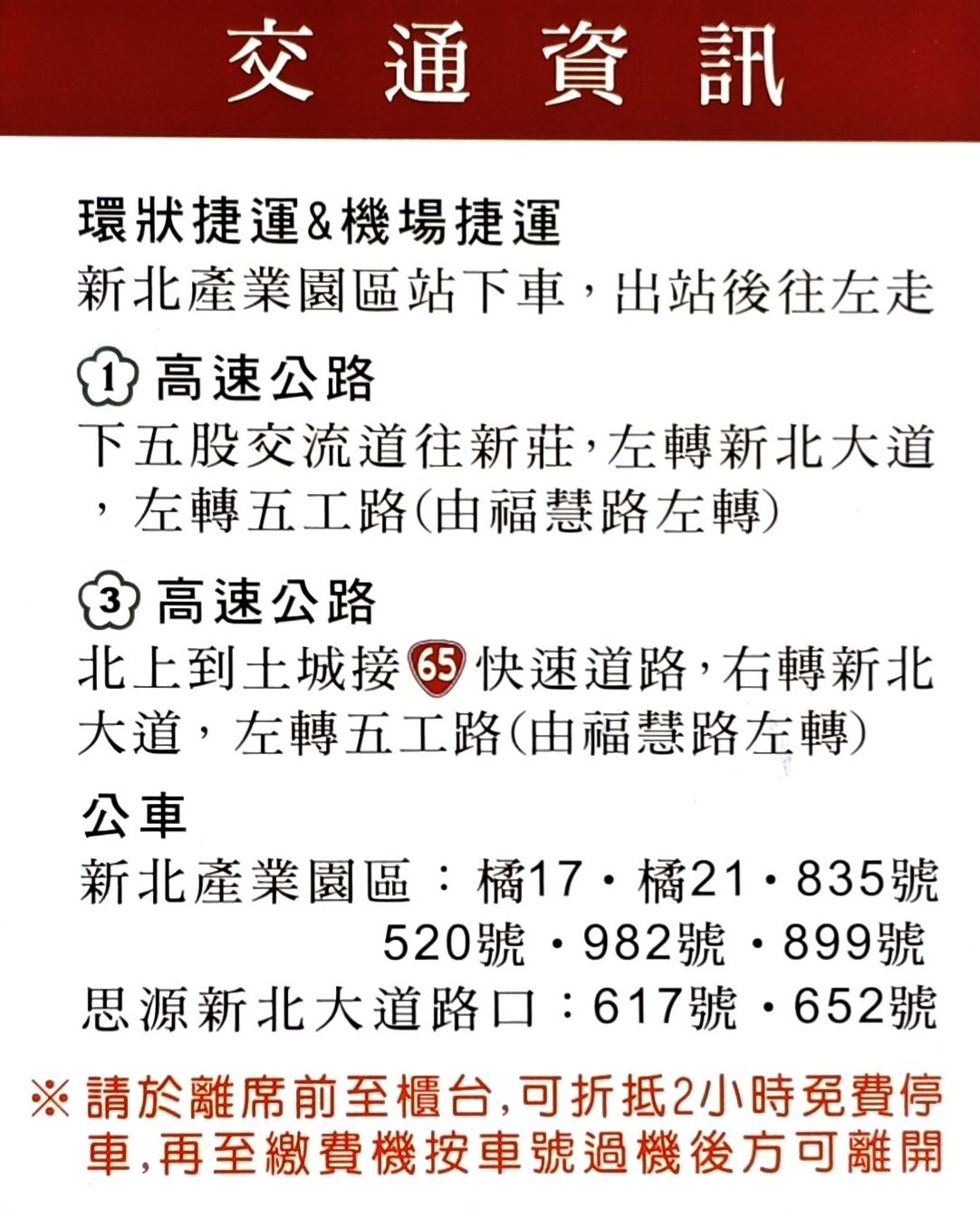 中和交流道下往新莊/五股前進,直走經大漢橋、思源路,至五工路口可抵達。